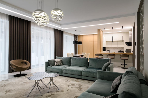 В него также можно встроить освещение. Это может быть как светодиодная лента, так и споты или треки. Они не только освещают пространство, но зонируют его, что особенно актуально для квартир-студий. Таким образом, делая единый пол во всем помещении, вы можете гармонизировать пространство с помощью потолка.