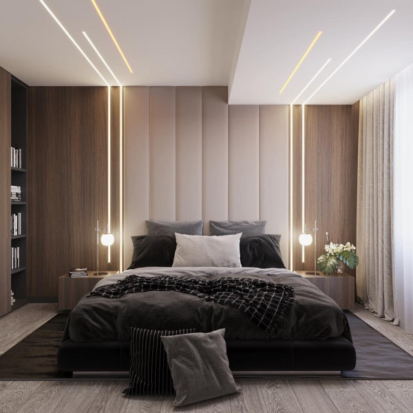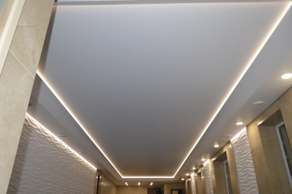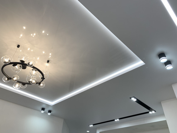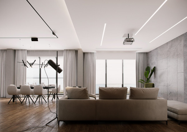 В него также можно встроить освещение. Это может быть как светодиодная лента, так и споты или треки. Они не только освещают пространство, но зонируют его, что особенно актуально для квартир-студий. Таким образом, делая единый пол во всем помещении, вы можете гармонизировать пространство с помощью потолка.