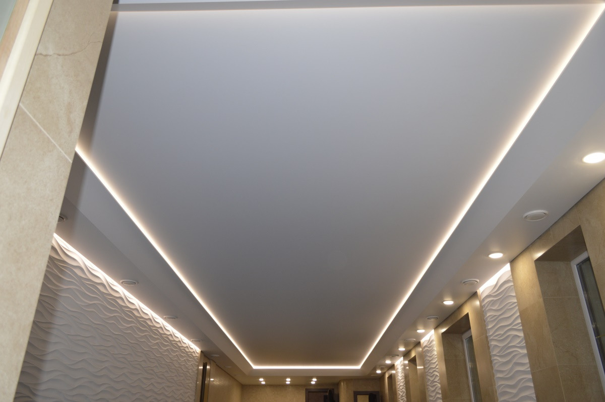 Второй ярус может быть цветным, выделяя определенную зону, например, в кухне над рабочей зоной или в гостиной над диваном, или выполненным в тон. Белый натяжной потолок визуально делает комнату больше.