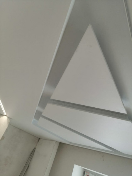 При создании двухуровневых потолков мастер учитывает конструктивные особенности помещения. Бывает, что два и более ярусов не прихоть, а необходимость. Например, если есть выступающие коммуникации (трубы вытяжки, вентиляции) или несущие балки, асимметричные углы. В этом случае второй уровень потолка выполняет маскировочную функцию.