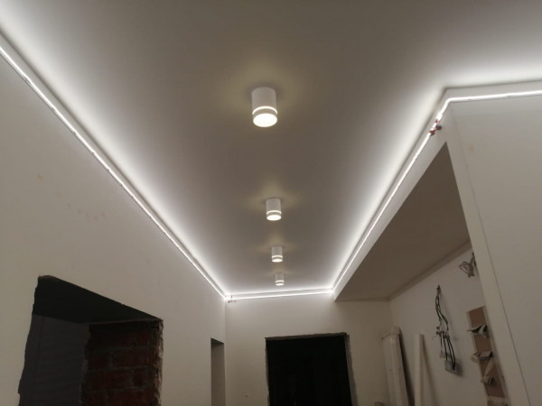 Есть несколько видов таких покрытий. Светодиодные ленты, оптоволоконные нити, споты, галогеновые прожекторы – с ними отделка потолка со встроенным освещением стала чрезвычайно разнообразной.