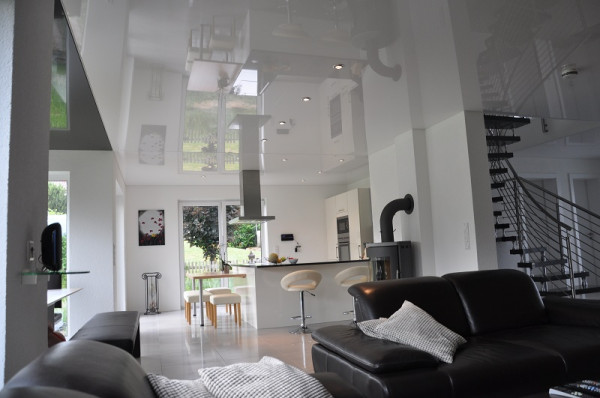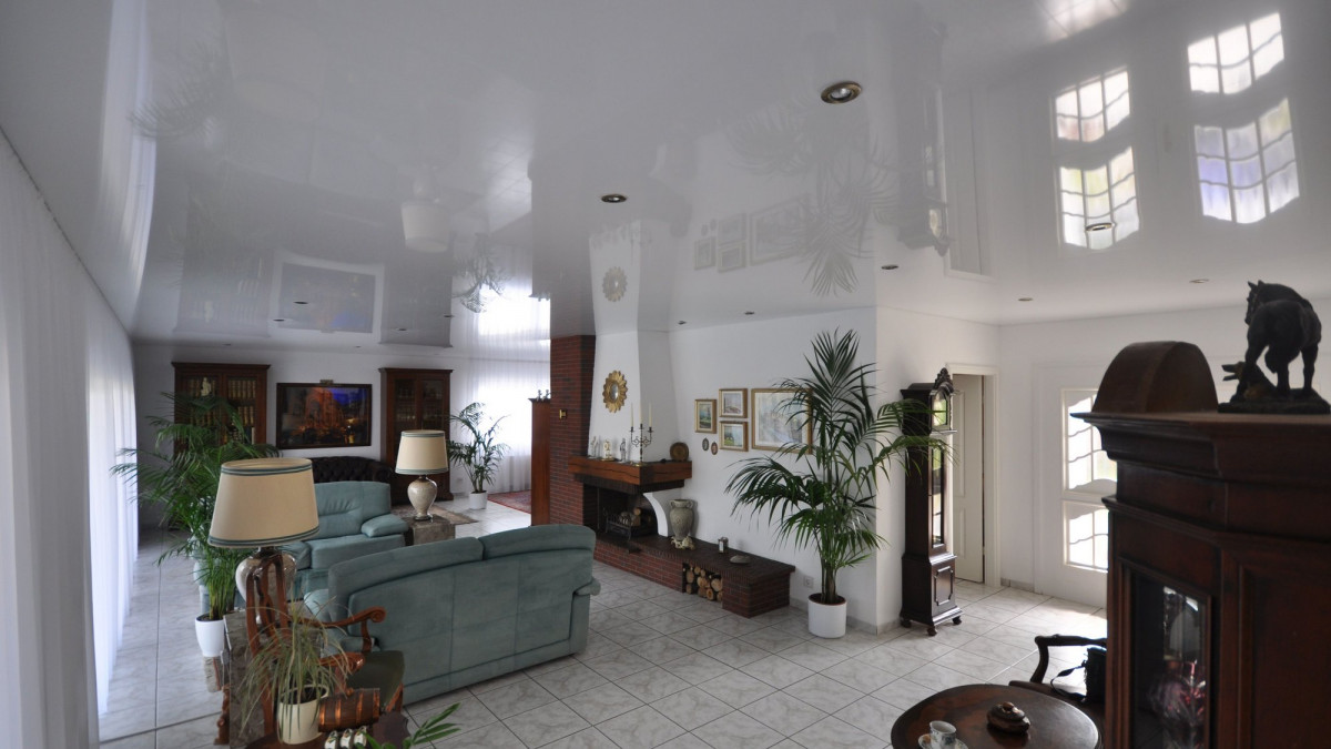 Сегодня очень многие покупатели выбирают для зала такой вариант отделочных материалов, как натяжные потолки. Их монтаж проводится очень быстро – зачастую он занимает не больше нескольких часов. При этом результат получается очень качественным и эстетичным благодаря тому, что натяжные потолки для зала скрывают все дефекты – поверхность становится идеально ровной. Кроме того, такие потолки могут быть выполнены с подсветкой.