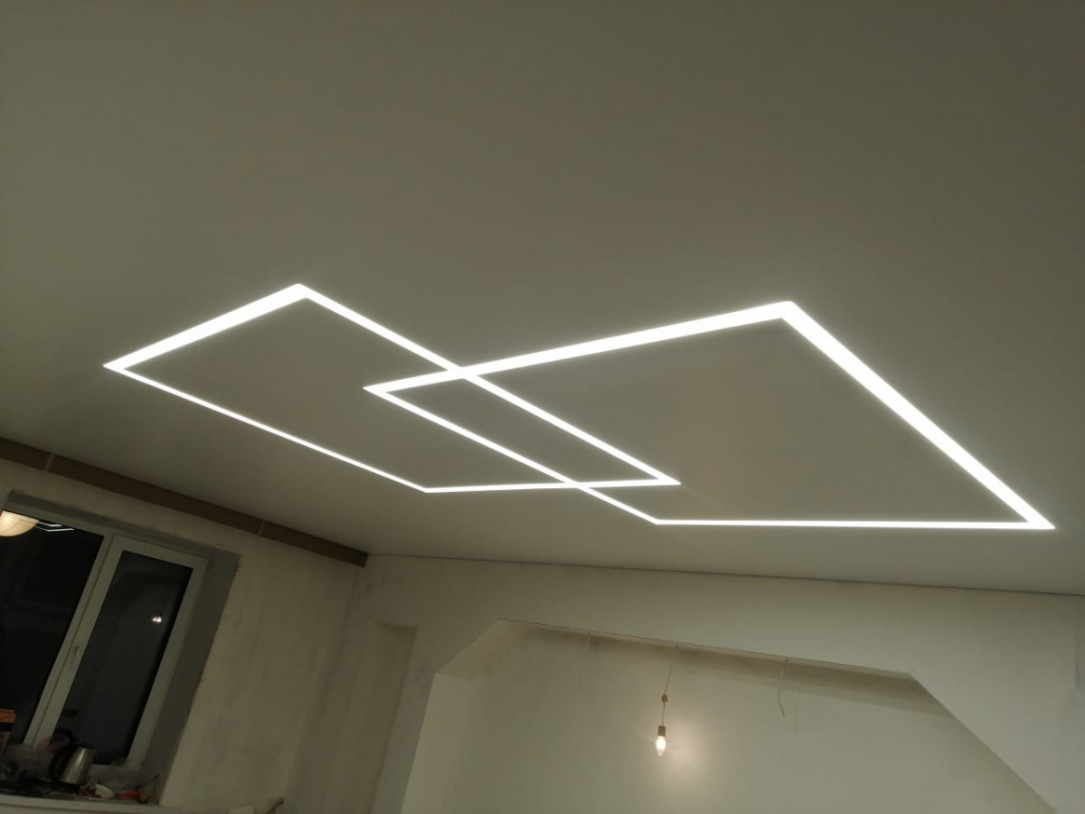 - После того, как проект размещения световых линий на натяжном потолке готов, мастер приступает к установке специальных профилей. Именно в них в последующем будут вмонтированы линии.